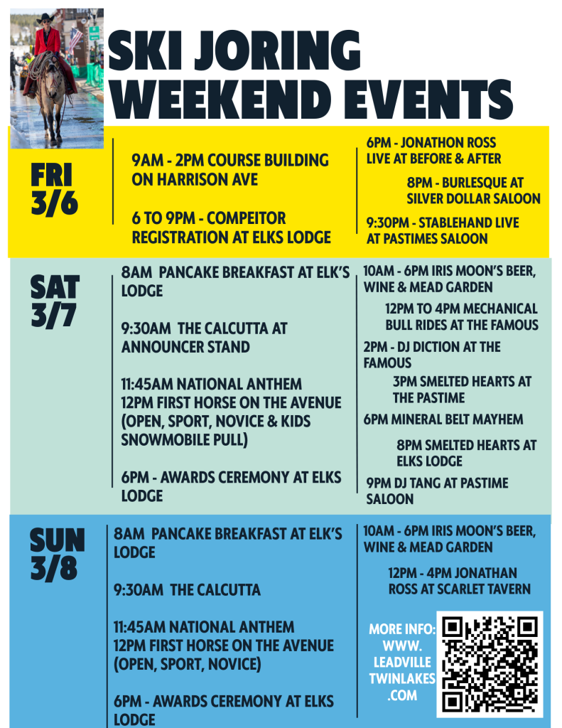 As event details may evolve, be sure to visit the official website, Leadville Ski Joring, at leadvilleskijoring.com closer to the event date for the most up-to-date schedule and information.