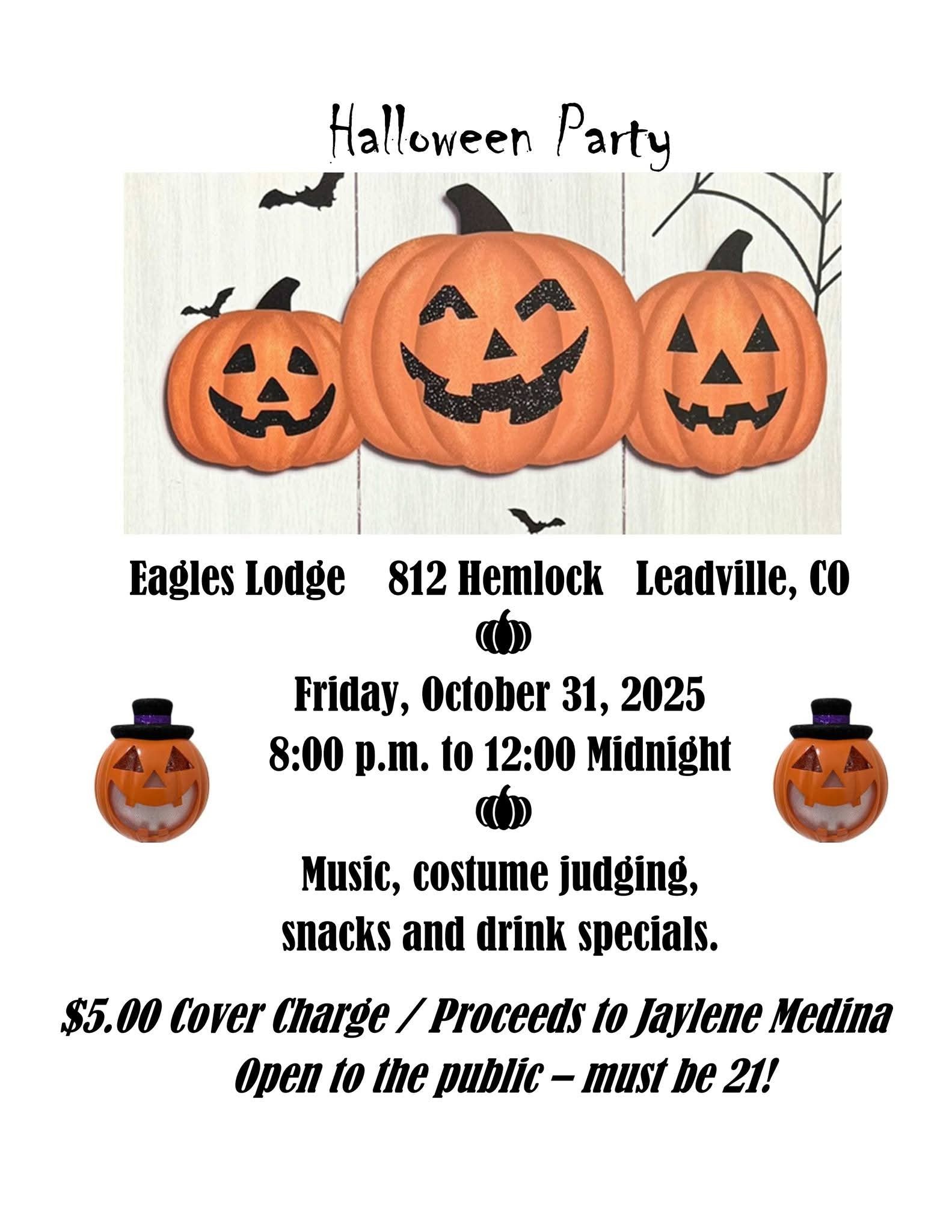 Come to the Eagles Lodge from 8pm to midnight on Friday, October 31st for music, costume judging, snacks and drink specials.