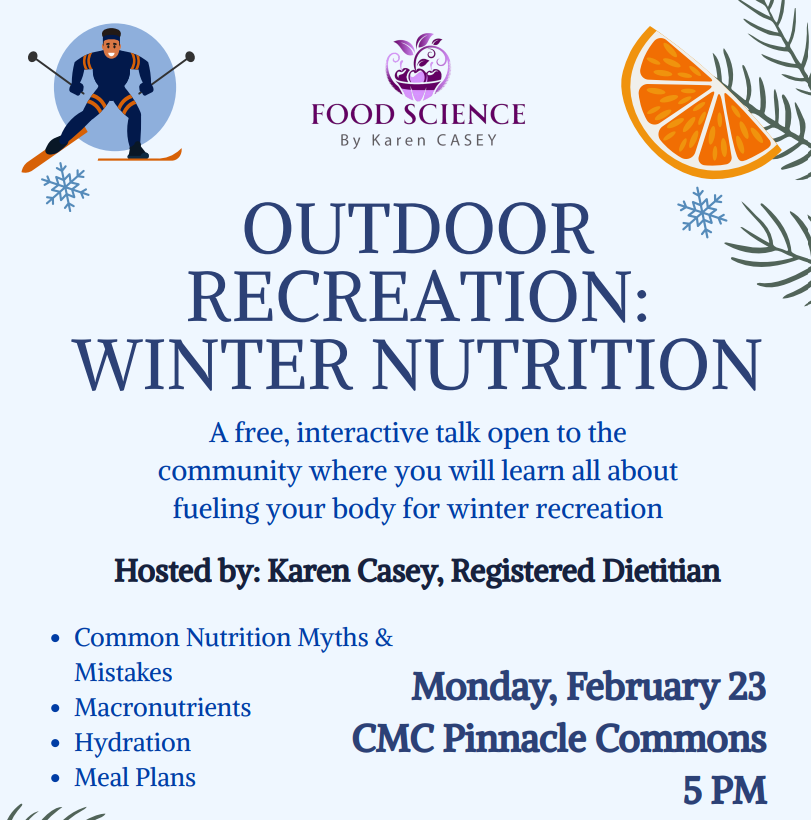 All are welcome to attend this free, interactive talk at CMC where you will learn all about fueling your body for winter recreation. Hosted by Karen Casey, a registered dietitian, this talk will explore topics such as common nutrition myths and mistakes, an overview of macronutrients, what hydration really means and what it takes, as […]