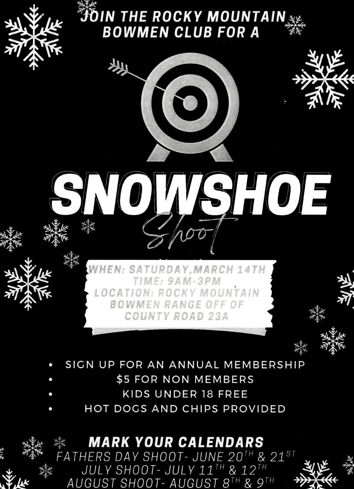 Join the Rocky Mountain Bowmen Club for the Snowshoe Shoot on Saturday, March 14th from 9am to 3pm Sign up for an annual membership or $5 for non-members, kids under 18 are free Hot dogs & chips are provided Location: Rocky Mountain Bowmen Range off of County Road 23A Mark your calendars for our future […]