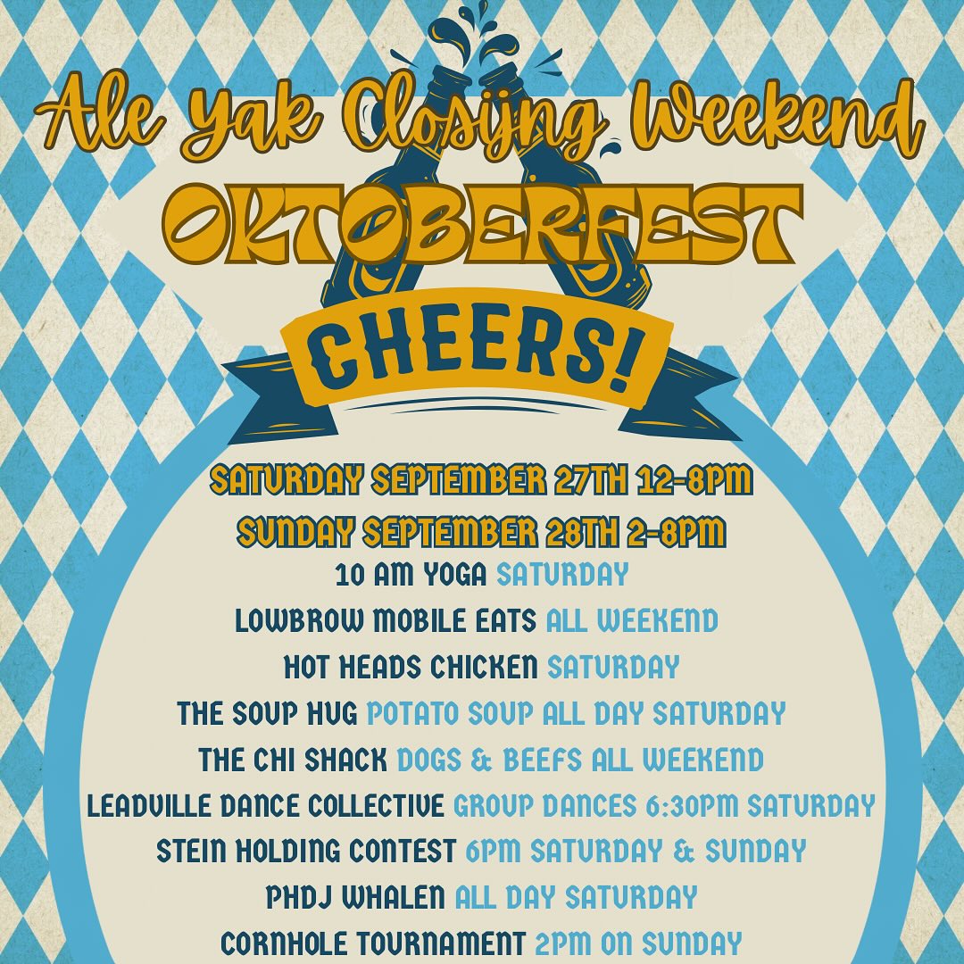 Save the date for Ale Yak's Oktoberfest celebration and closing weekend! Great food drink and fun all weekend long! Saturday, September 27th from 12pm to 8pm 10:00am Yoga 6:00pm Stein […]