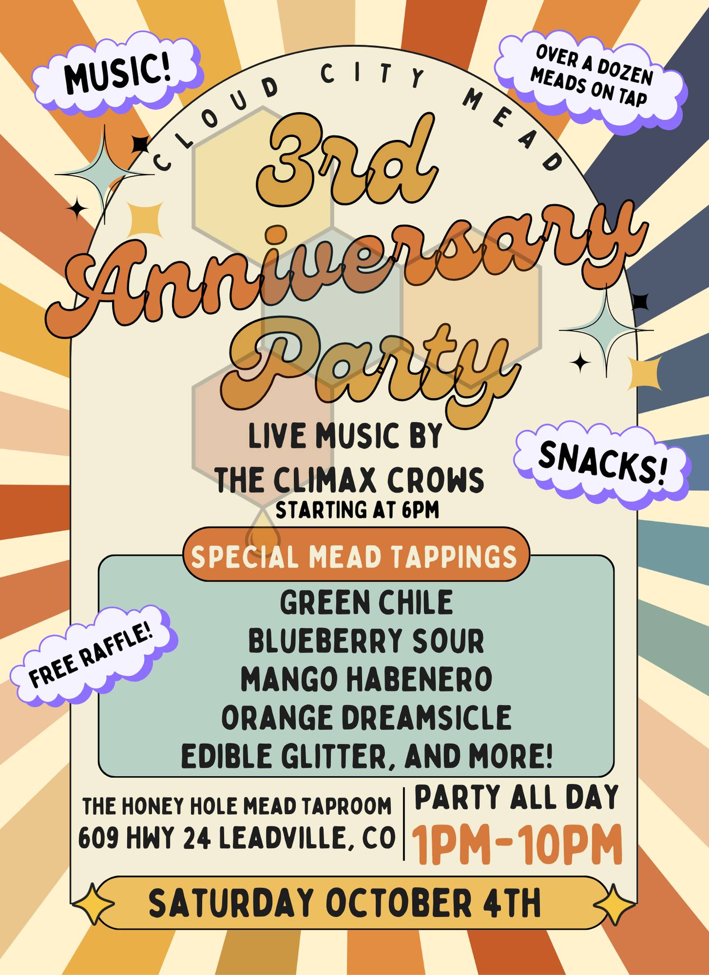 Cloud City Mead's Honey Hole Tap Room 609 D HWY 24, Leadville, CO, United StatesThis fall Cloud City Mead is celebrating 3 years of modern mead in Leadville and 1 year of the Honey Hole Tap Room. We will have live music with The […]