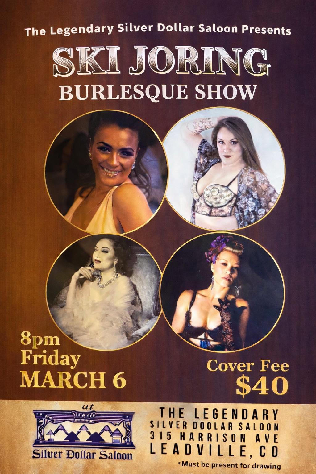 Come to the Legendary Silver Dollar Saloon on Friday, March 6th at 8pm for the annual Leadville Ski Joring Burlesque Show! $40 cover. Don't be late event usually sells out!