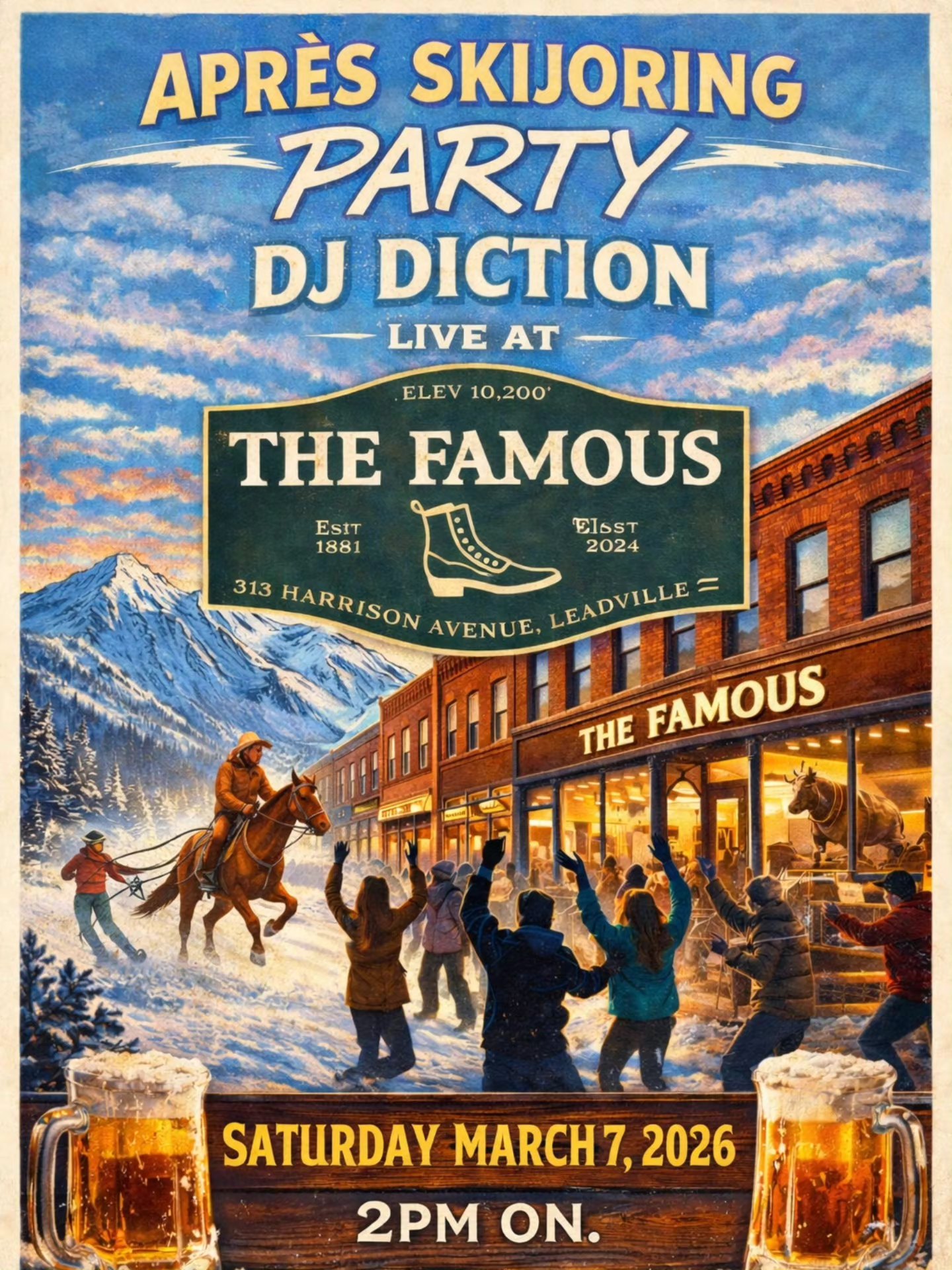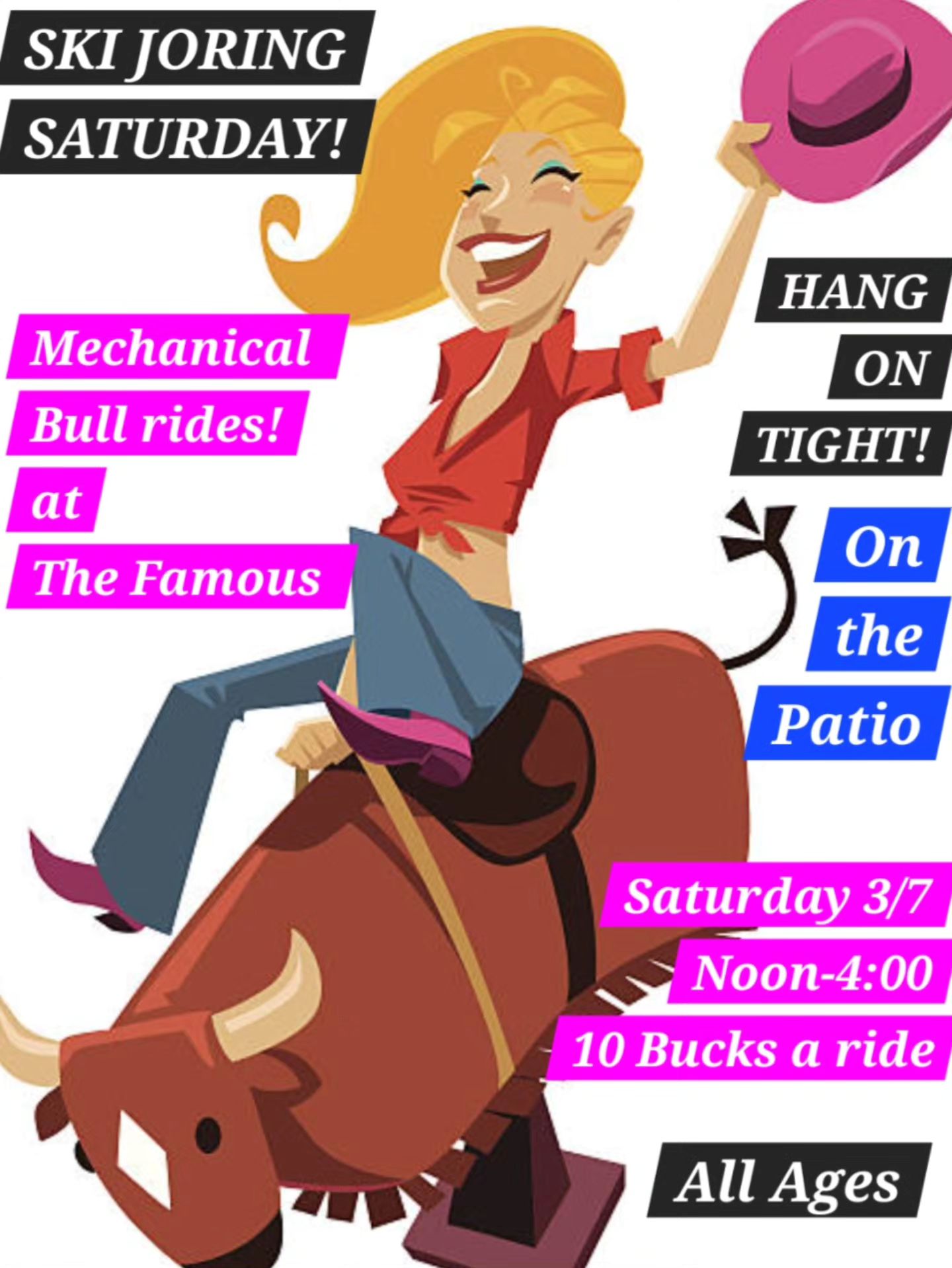 Come take a ride of your own this Saturday during Leadville Ski Joring. The Famous is offering mechanical bull rides on their patio Saturday, March 7th from 12pm to 4pm. $10 a ride, all ages welcome.
