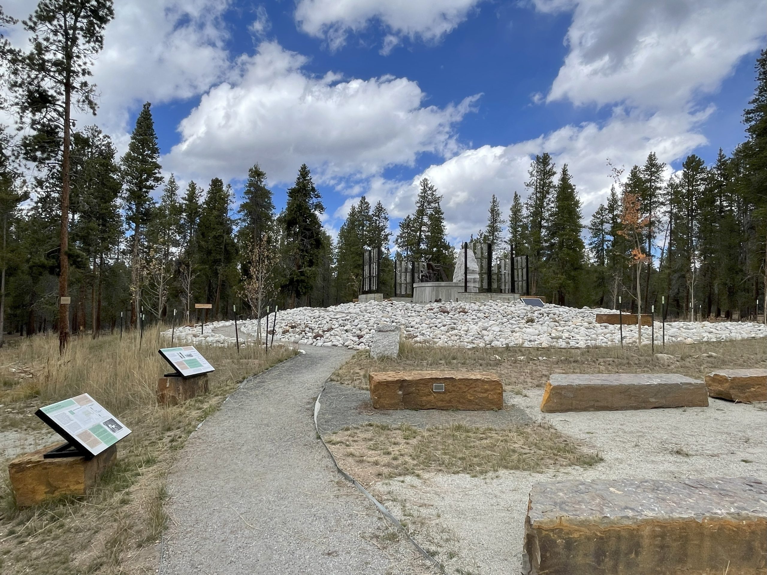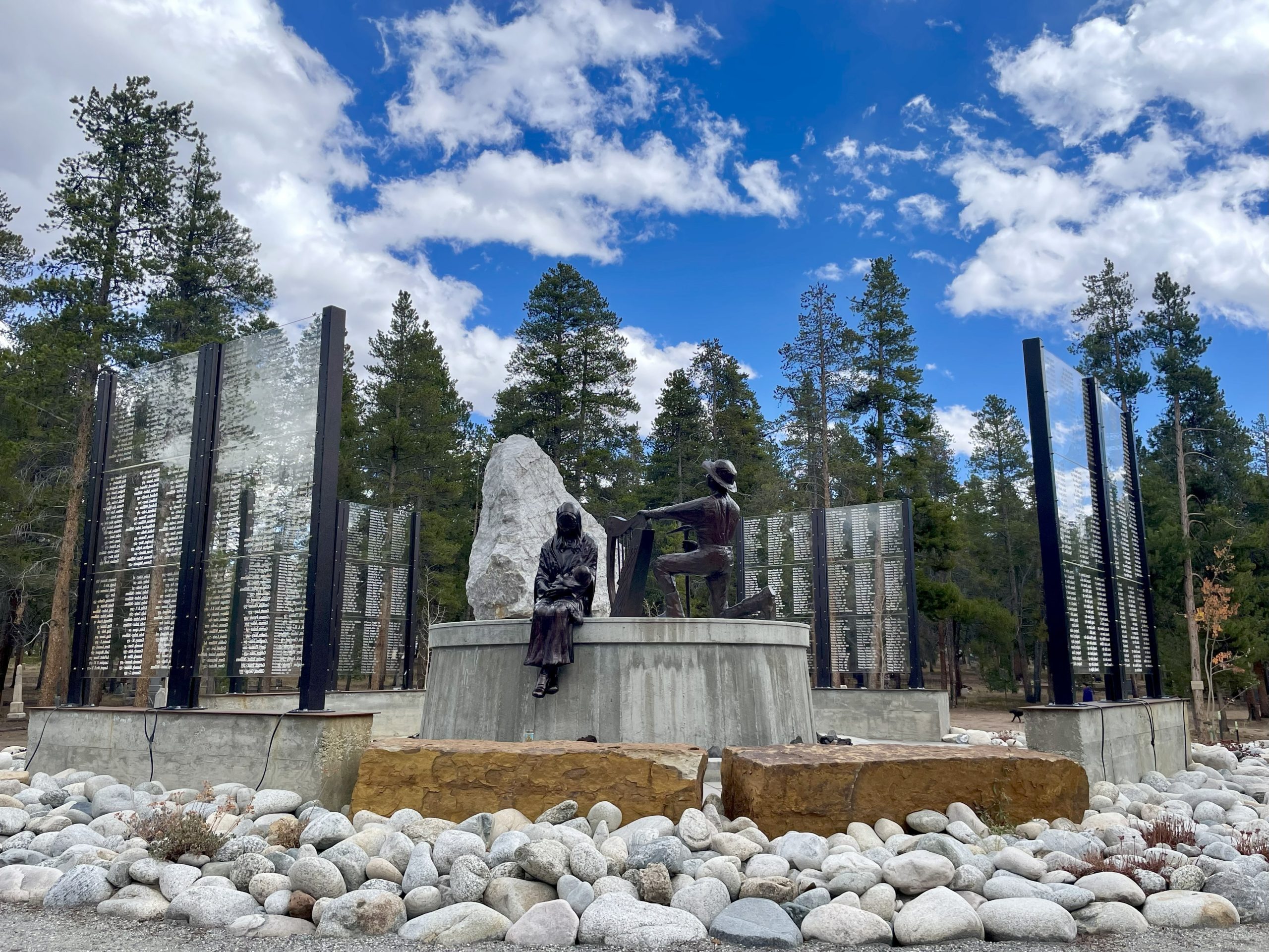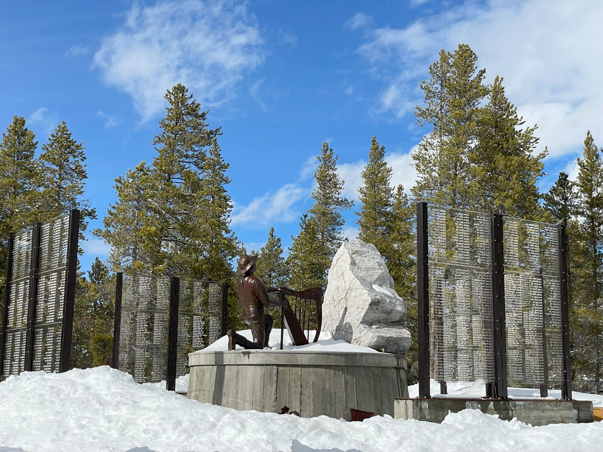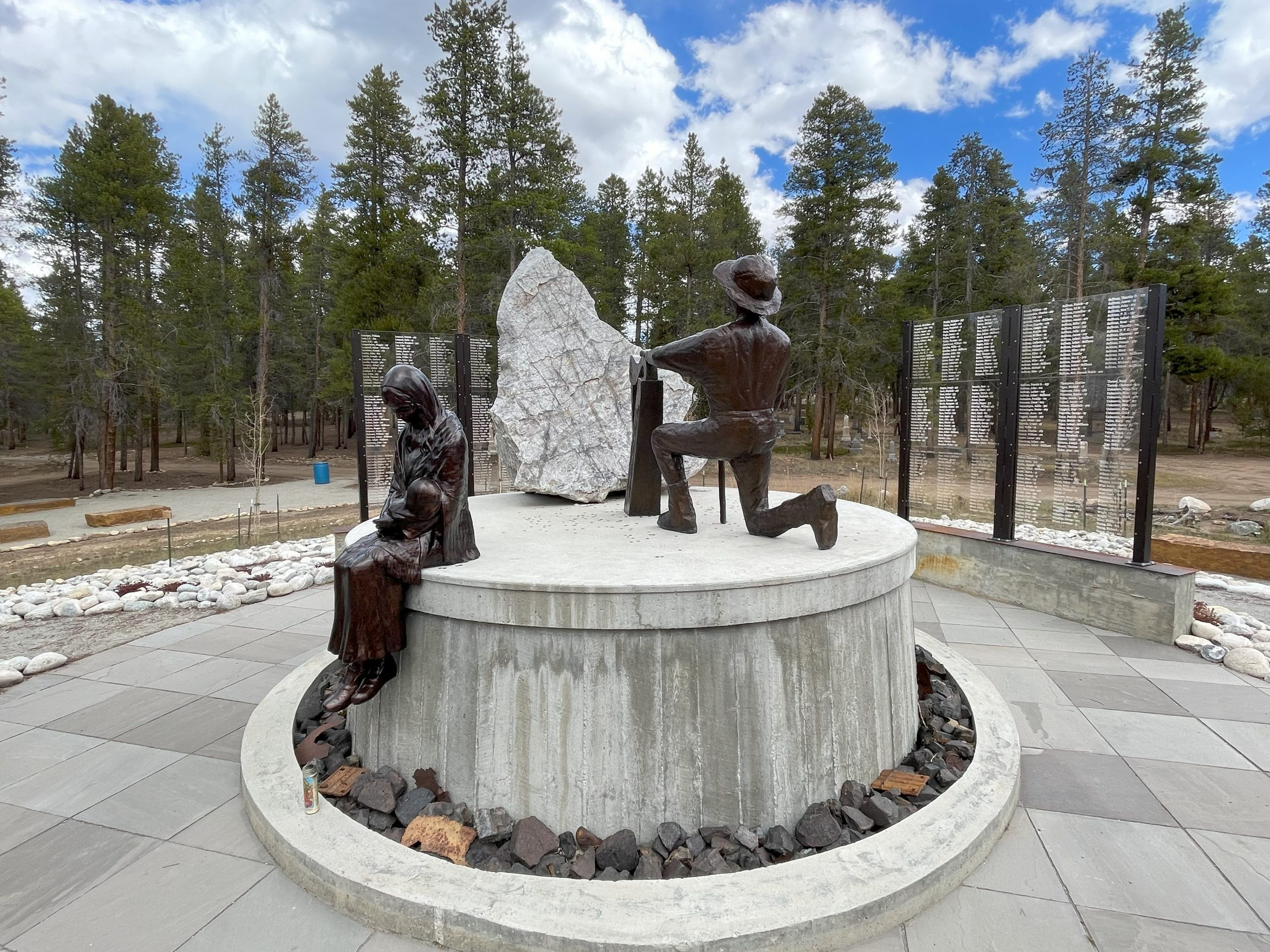 The miner, Liam, who was created in Ireland by Terry Brennan and shipped to Leadville, is holding a harp in one hand and a pickaxe in the other. Along the path are glass panels that list the names of immigrants who were buried in the now-sunken graves nearby.