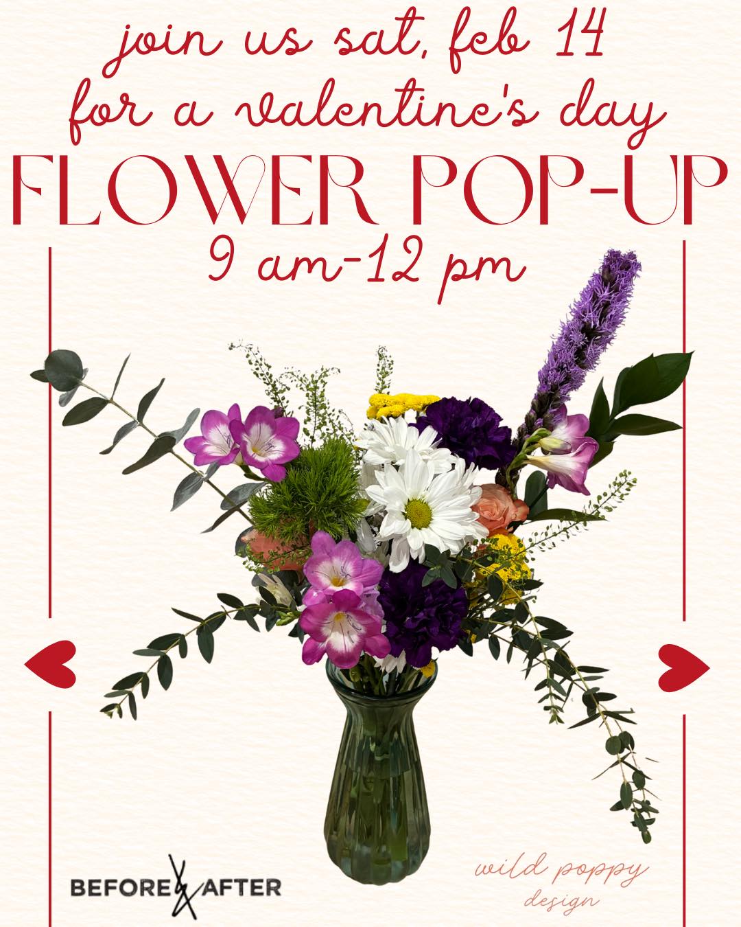 Join us at Before & After on Saturday, Feb 14th from 9am to 12pm for a Flower Pop-Up with Wild Poppy Design, who will be on-site selling beautiful Valentine’s bouquets Swing by for coffee and a pastry & grab flowers for someone you love (including yourself)! Come early, bouquets are first come, first served.