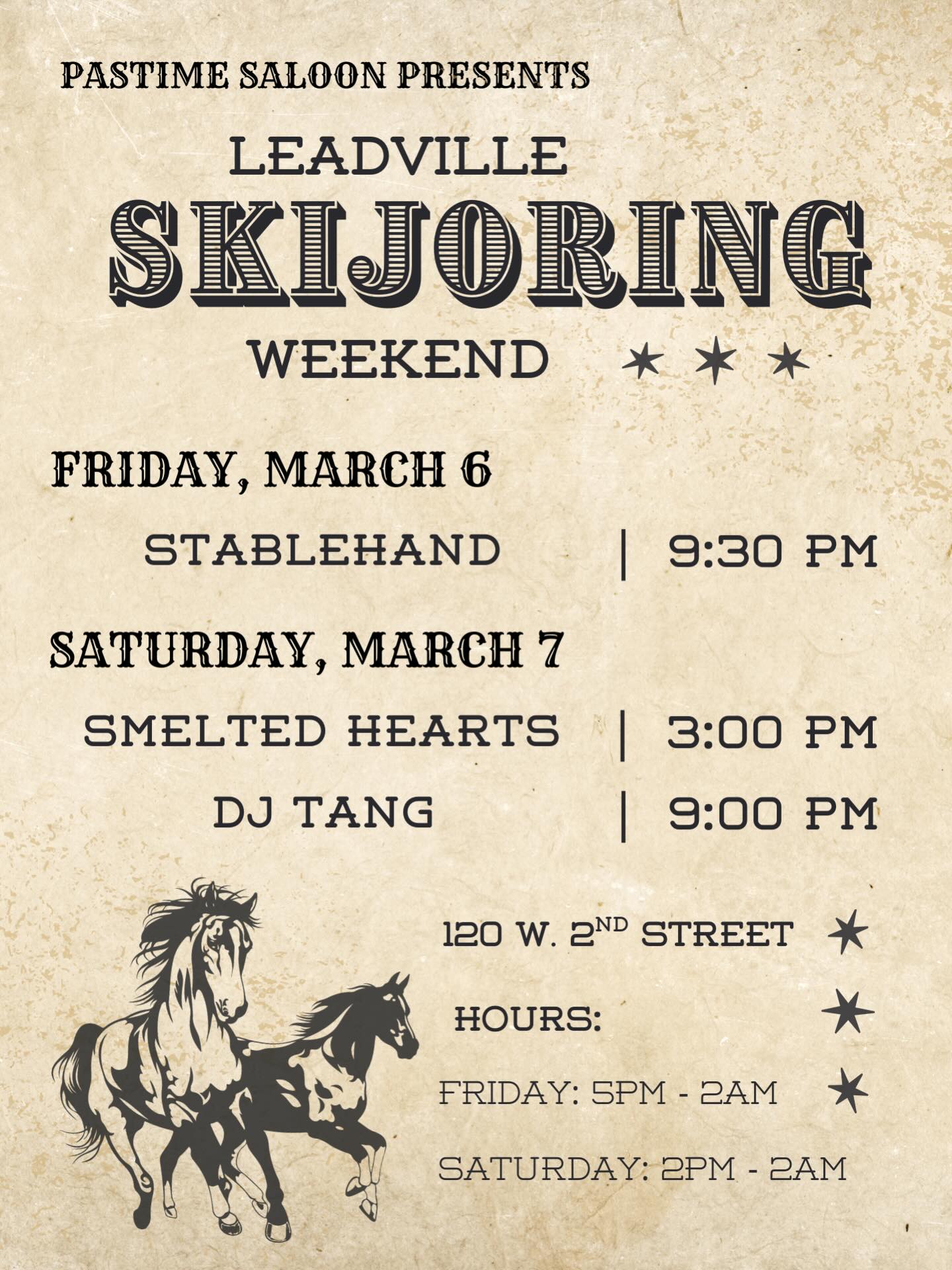Stablehand Live at Pastime Saloon March 6 @ 9:30 pm Pastime Saloon 120 W. 2nd Street, Leadville, CO, United States Ski Joring weekend is upon us! Start it out right with local folk/jamgrass band - Stablehand live at the Pastime Saloon Friday, March 6th starting at 9:30pm Free