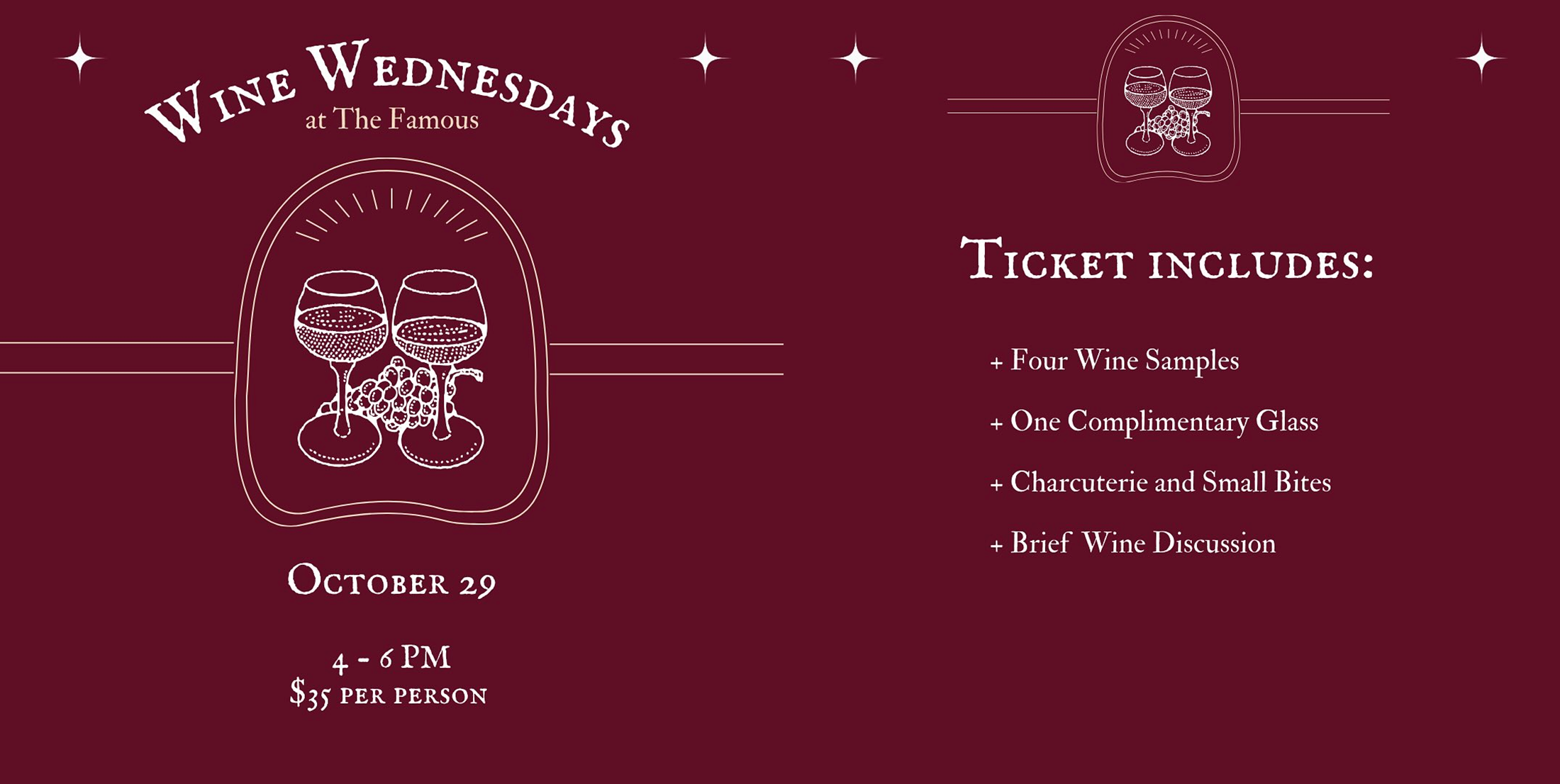 Join us at The Famous on the last Wednesday of each month for Wine Wednesdays. Tickets are $35 and include 4 pours of regional wine samples, one full glass of your favorite, a brief discussion about the grapes & region, and a beautiful charcuterie board. Held on the last Wednesday of the month from 4-6PM, […]