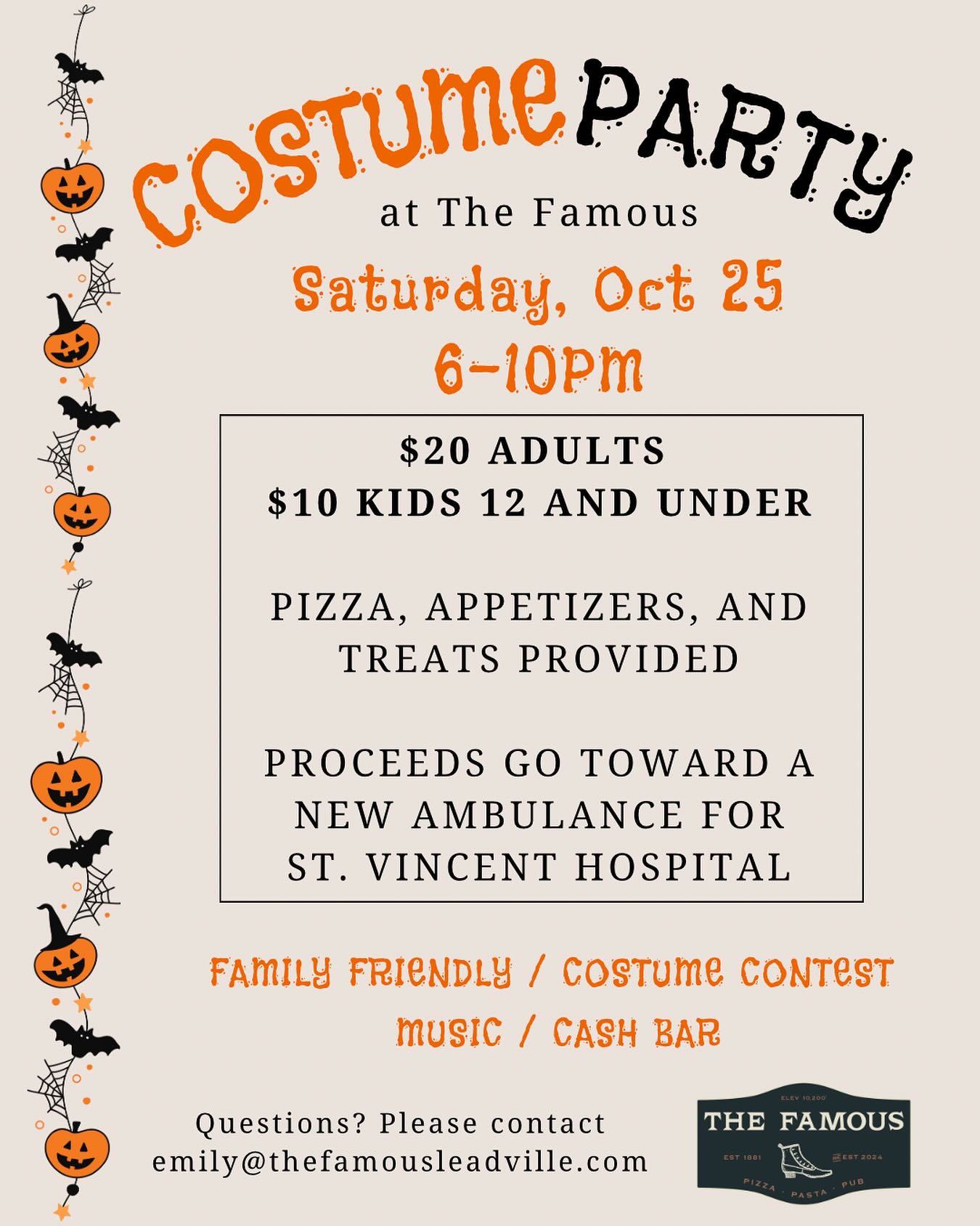 Join us on Saturday, October 25, for a costume party at The Famous!$20 for adults, $10 for kids 12 and under- Pizza, appetizers, and treats provided- Proceeds will help fund a new ambulance for St. Vincent Hospital!We’ll have a costume contest with prizes, music, and drinks available for purchase!