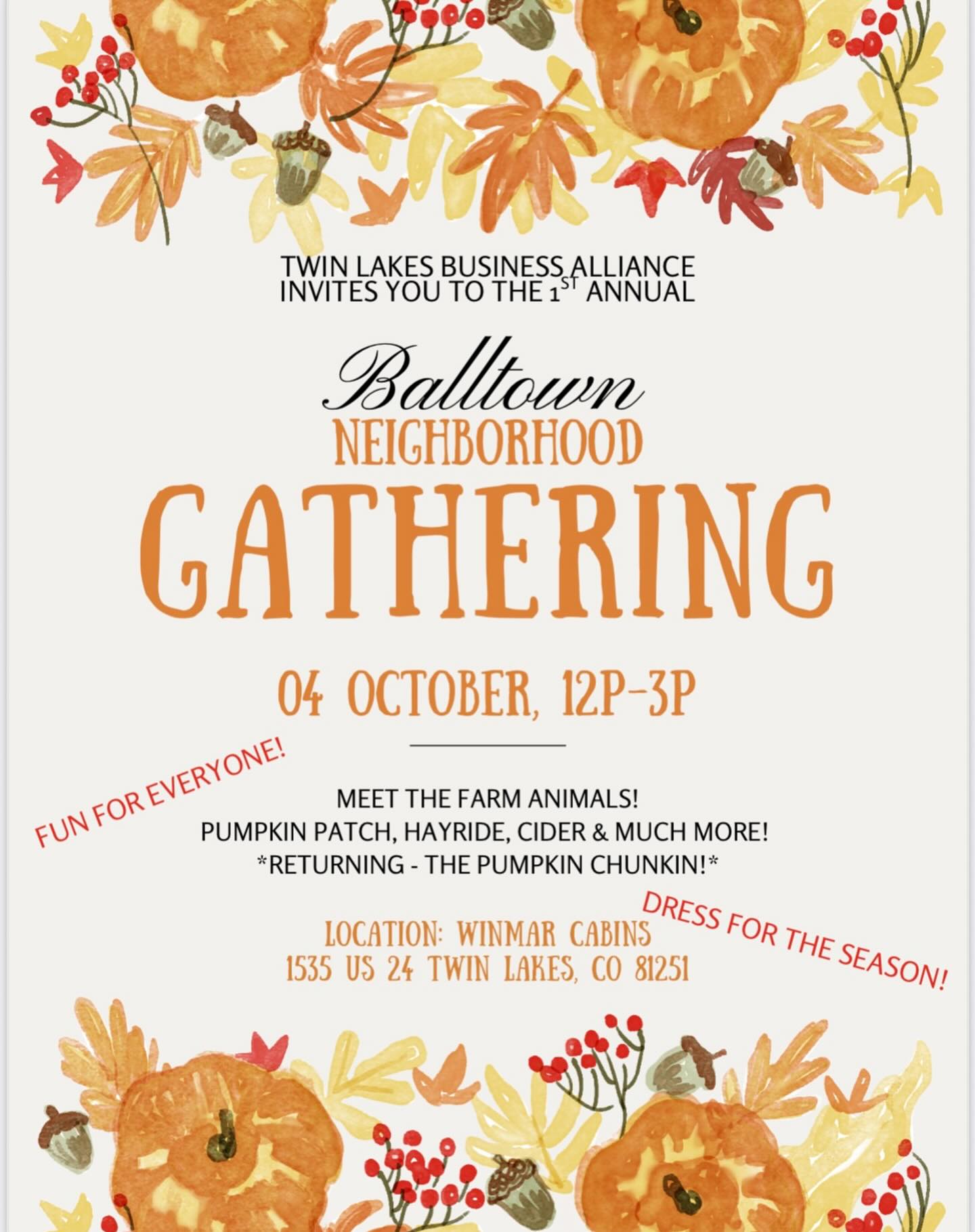 Winmar Cabins 1535 US-24, Leadville, CO, United StatesThe festival is Saturday, October 4th, from 12-3 at Winmar Cabins. Come for a pumpkin patch, chili cook off, pumpkin chucker, bonfire with s’mores, bobbing for apples, and hay rides to Tenderfoot Farm to give the farm animals their Halloween treats.